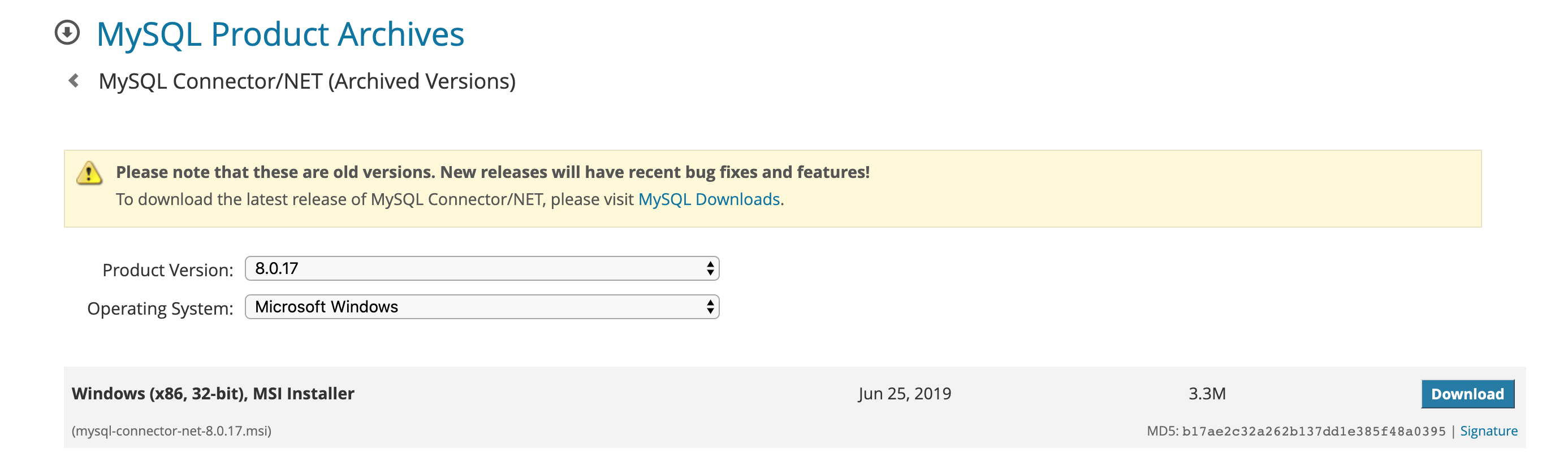 •Install Version 8.0.17 (select it at the top) https://downloads.mysql.com/archives/c-net/
