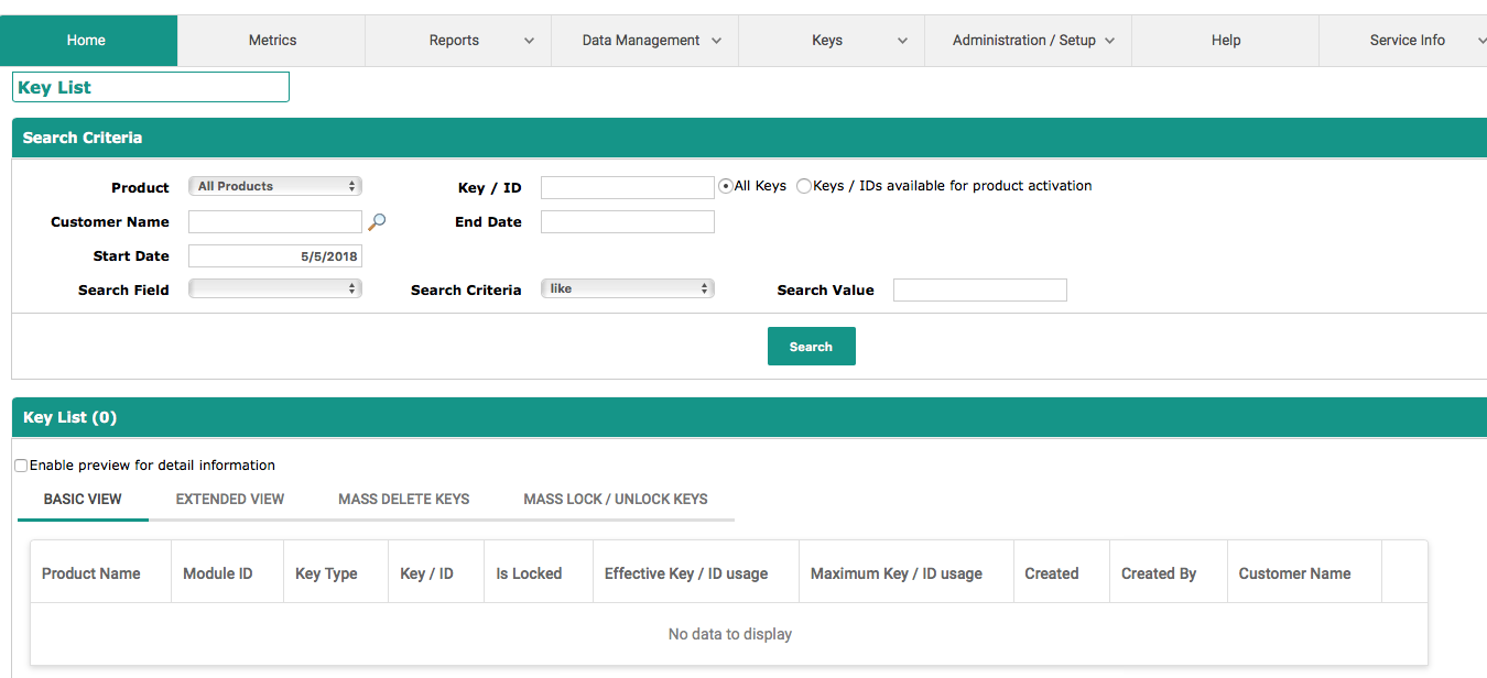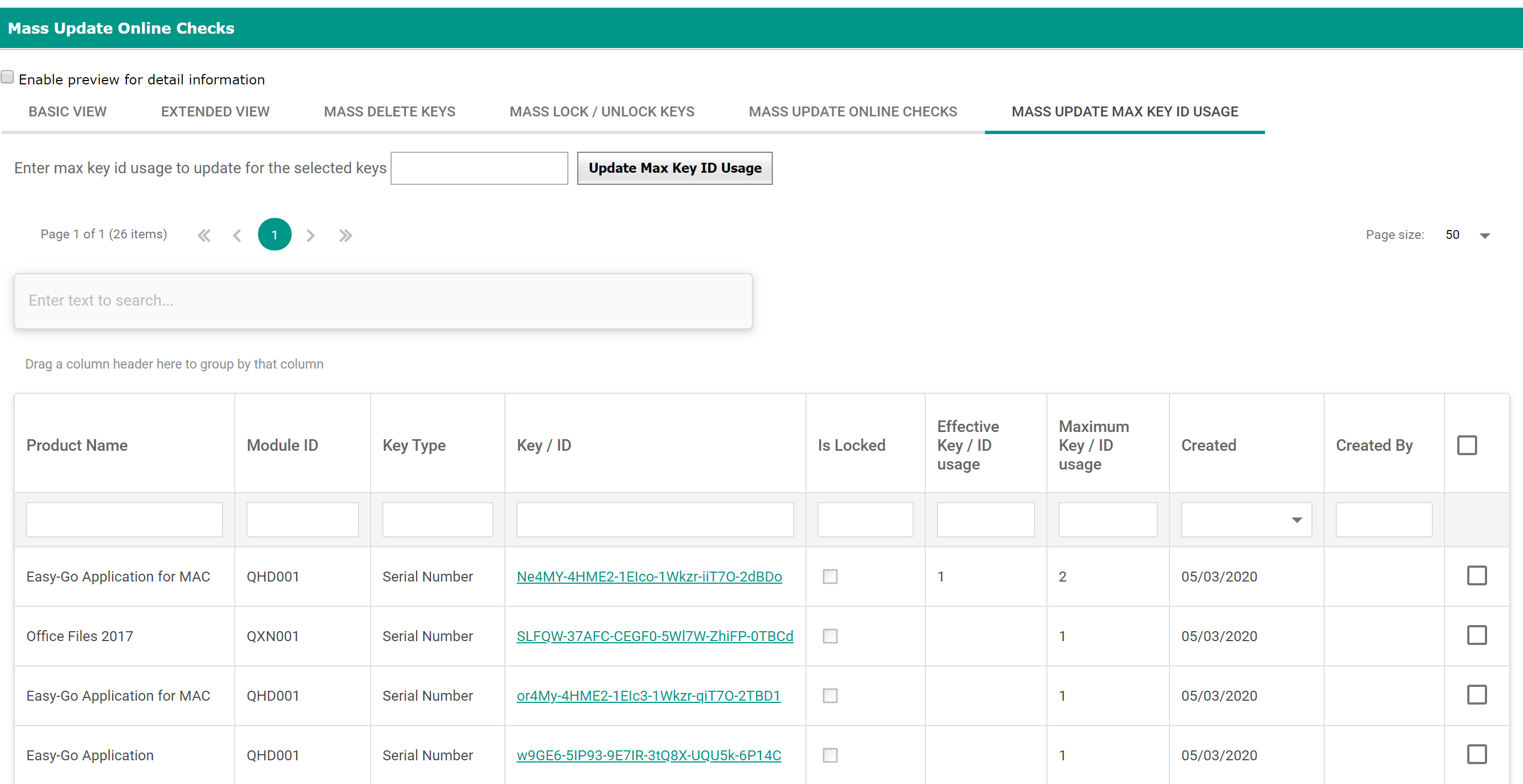 The Key List displays all Serial Numbers / IDs / Activation Keys
