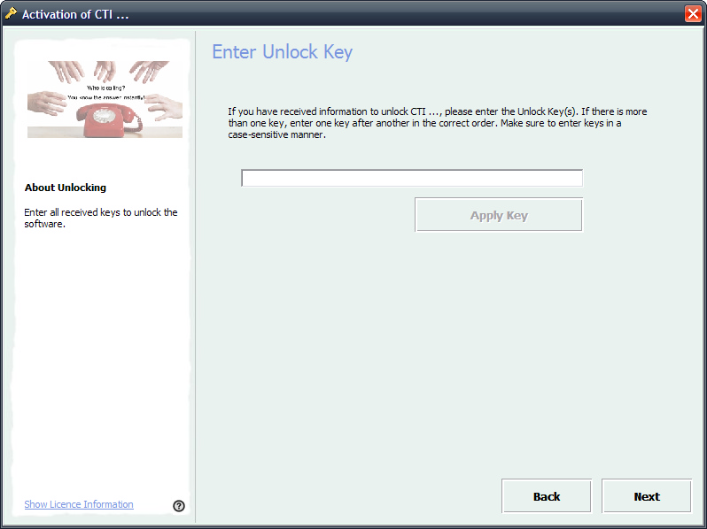 After requesting the Unlock Key by fax, the screen shown below will appear during each start of the program. Type in the Unlock Key you got back by e-mail or fax. Press the button Next. If the Activation is successful, the screen Activation finished is displayed.