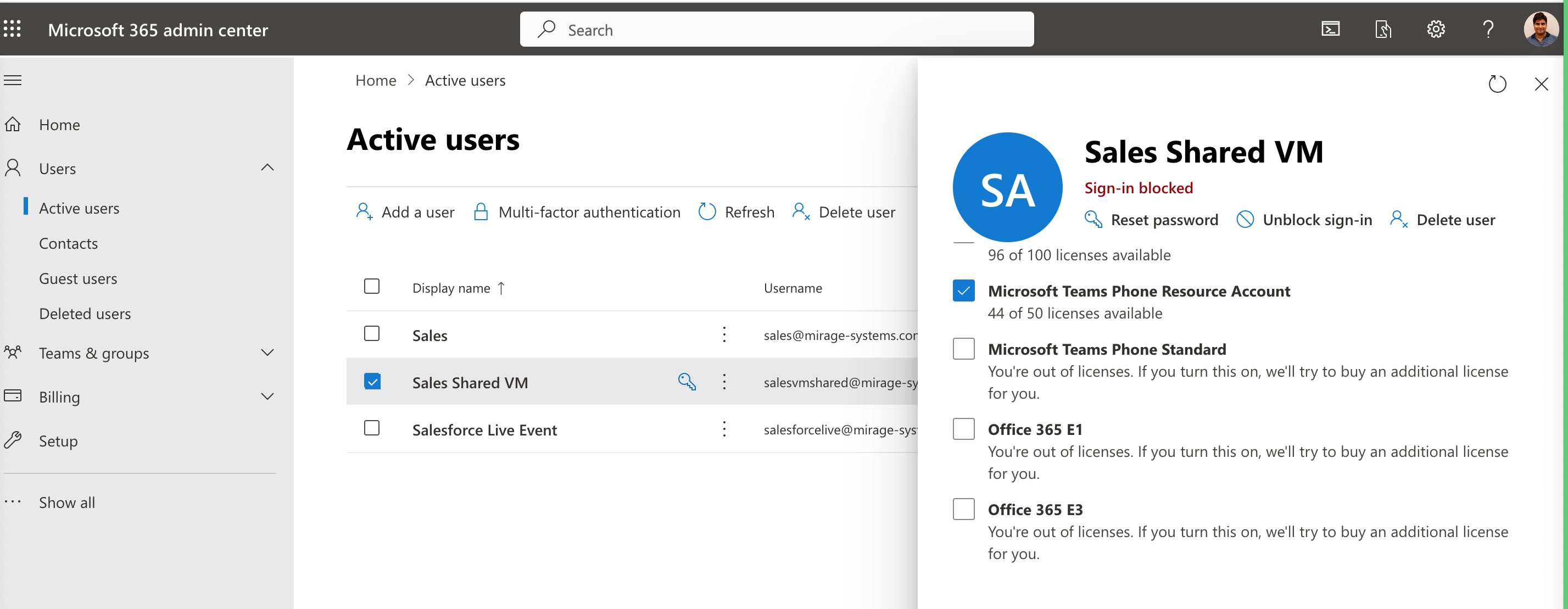 vi.Wähle den Resource Account aus und weise die Lizenz Phone Resource Account zu. Falls nicht vorhanden, kann sie im Bereich Billing kostenlos hinzugefügt werden.