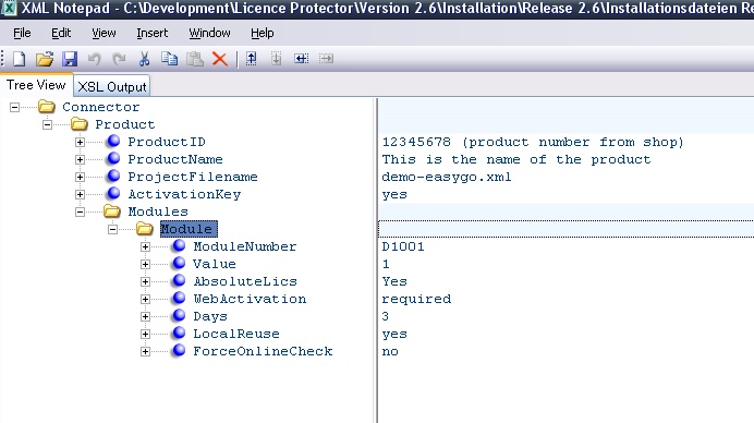 This file includes the definition, with which options the Serial Number should be created. Use the same values like you would use within the Licence Generator and manual generation. You have to change in the sample file: