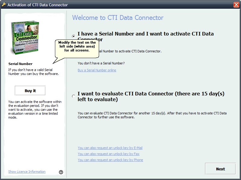 Help text that is displayed on the left side of the EasyGo form on the Unlock page that handles the Unlock Key input for the manual registration methods (E-Mail, Fax, phone).