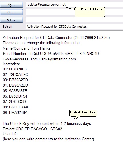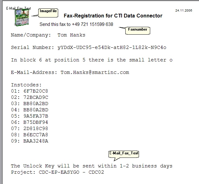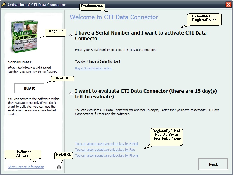 lic.SetRegisterSettings(‘c:\temp\myimage.jpg’, // ImageFile true, // Allow LicenceViewer true, // Serial is a Key 'My Company', // Manufacturer ‘My Product’, // Productname true, // Register Online true, // Register By E-Mail ‘activate@mycompany.com', // E-Mail-Address true, // Register By Fax '012345/6789-1', // Faxnumber false, // Register By Phone '', // Phonenumber '', // E-Mail Fax Text 0, // DefaultMethod 'http://www.mycompany.com/buymyproduct', // Buy URL '', // CopyProtectSwitchOnKey ''); // CopyProtectSwitchOffKey ... |