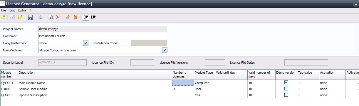 Navigation: Implementing EasyGo > Create Licence File > Define number of licences |
