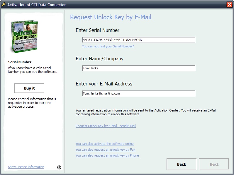 Request Unlock Key After filling out the screen, select: Request Unlock Key by E-Mail - send E-Mail. This will open your default E-Mail client. An e-mail with the hardware IDs and licence information will be created. Press send to send the e-mail to our activation center. You will get an Unlock Key back within 2-3 business days.