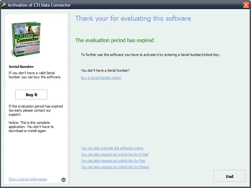 If the customer should not be able to start the application without having a Serial Number (no trial period), then the screen below is the start screen. A future release will offer a different wording. You add your individual text on the left side using the command SetRegisterHelp.