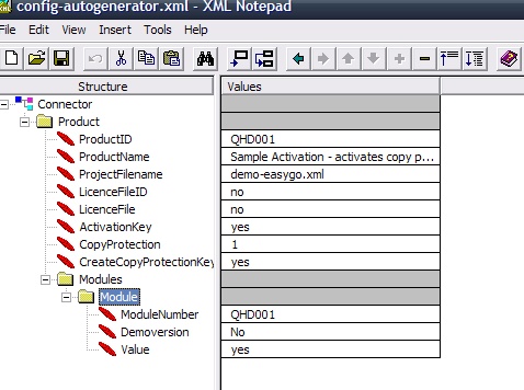 This file includes the definition, if a copy protection key should be generated, switch of Demoversion and delete time limitation. You have to change in the sample file: