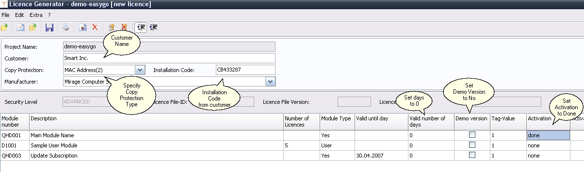 The customer has to transmit the 8 digit installation code. The next step is to create a customer specific licence file (using the customer name, the installation code and all the modules the customer has bought). It is important to set the field status of Activation to Done. If the full version should have no time limitation, set Valid number of days to 0, Demo version to No and all other modules to the customer specific values. Select the desired Copy Protection method and type in the installation code the customer sent to you. Each licence file gets a new licence file ID (like a serial number).