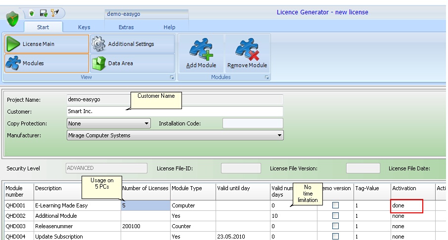 | • | use a module from type computer/PC - this limits the usage to the defined number of computers (recommended option). To define an unlimited usage, just configure a license with 9999 computers |