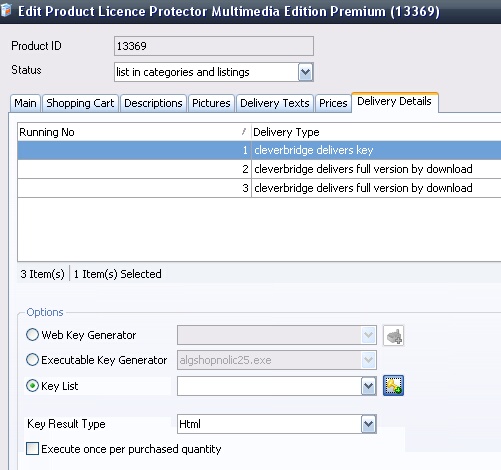 Start the cleverbridge Commerce Assistant and edit a product. In the TAB Delivery Details you specify which keys are delivered.