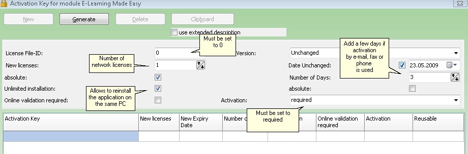 Press the button New and select Activation: required. Then press: Generate. The key is copied into the clipboard.
