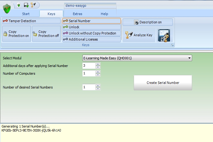 After pressing the button Create Serial Number, the key(s) including the extended description is/are copied into the text box. If only one key is generated, it is also copied into the clipboard.