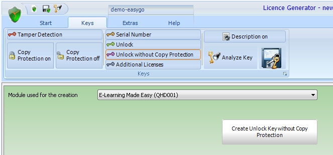 After pressing the button Create Unlock Key without Copy Protection, including the extended description is copied into the text box. It is also copied into the clipboard. The content of the text box can be saved to a file with the button Save generated keys to file.![]()