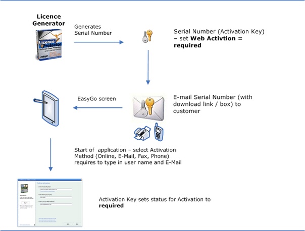 Depending on your business workflow, there are 3 options to generate a Serial Number (manually, automatically with a key list, automatically after the order process). The Serial Number is sent to the customer. After receiving the Serial Number, the customer selects an activation method (Online, E-Mail, Fax, Phone) and types in the Serial Number, name and E-Mail.