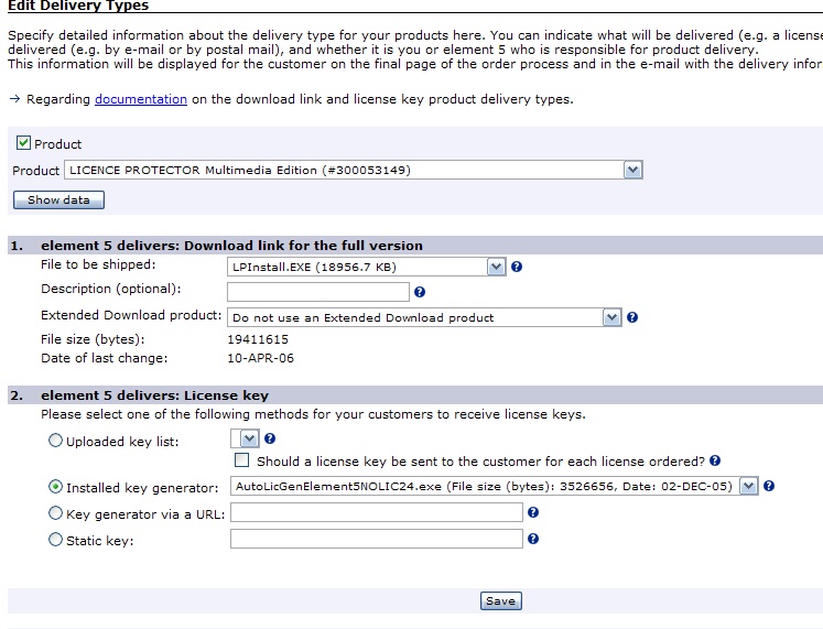 Start the Element5 / Share-it! Control Panel. Within the option Product Delivery you specify the Automatic Generator, which the shop System invokes after the order process. See - Send files to Element5 / Share-it! - how to upload the necessary files.