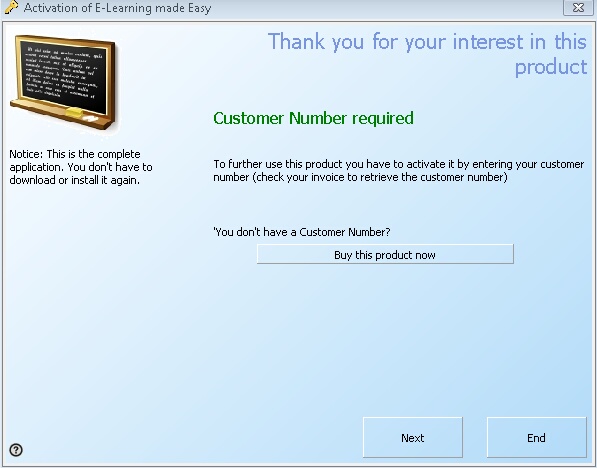 SetCustomText (2,657,'To further use this product you have to activate it by entering your customer number (check your invoice to retrieve the customer number)')