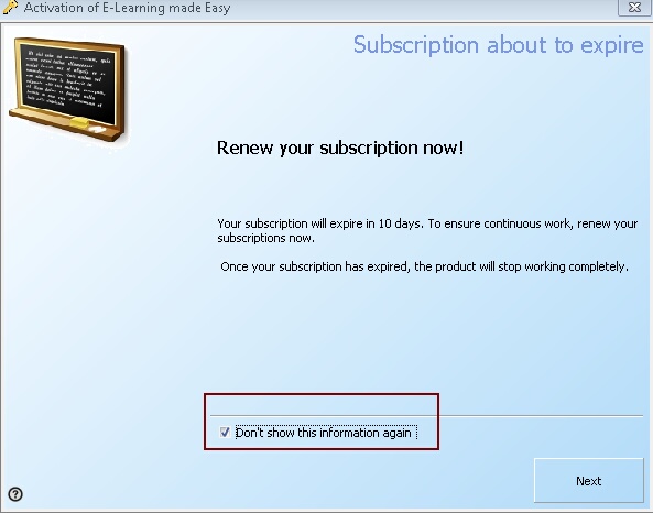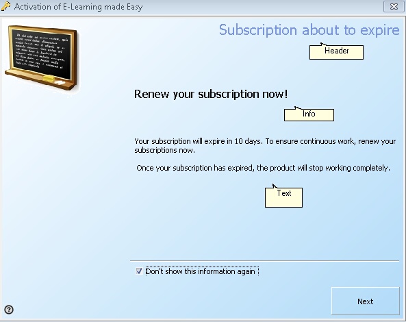 iRes := lic.SetRegisterSetExpiryWarning (‘myapp-m1’,10,5,'Subscription about to expire','Renew your subscription now!','Your subscription will expire in 10 days. To ensure continuous work, renew your subscriptions now.\n\nOnce your subscription has expired, the product will stop working completely.',' ');