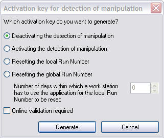 | • | Reset global Run Number - should be used with multi user installations to unlock the system after a Tamper Detection. As every PC has to be unlocked, the period of time has to be specified within which each PC has to start the application |