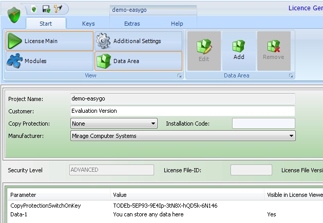 Select Data Area in the main screen. It allows to edit and modify data, which is stored in the data area of the license file. For full details see chapter Store data in the license file.