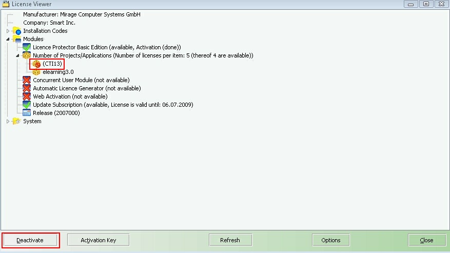 If you don't need a project any more, you can deactivate projects with the Deactivate button (highlight the project name) to gain free licenses. To buy additional licenses, select TAB Help,
