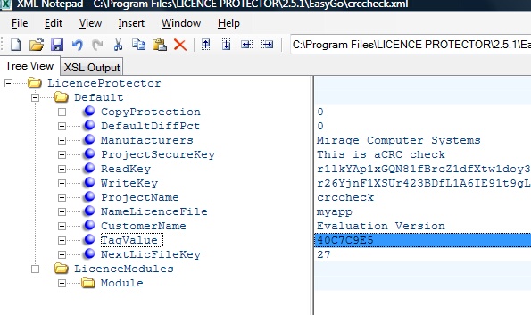 Now retrieve the CRC value of your EXE file - how to retrieve the CRC see CRC Check of the Licence Protector DLL. You could use GetCRC32 value if first checked the DLL to be sure that it is not cracked.
