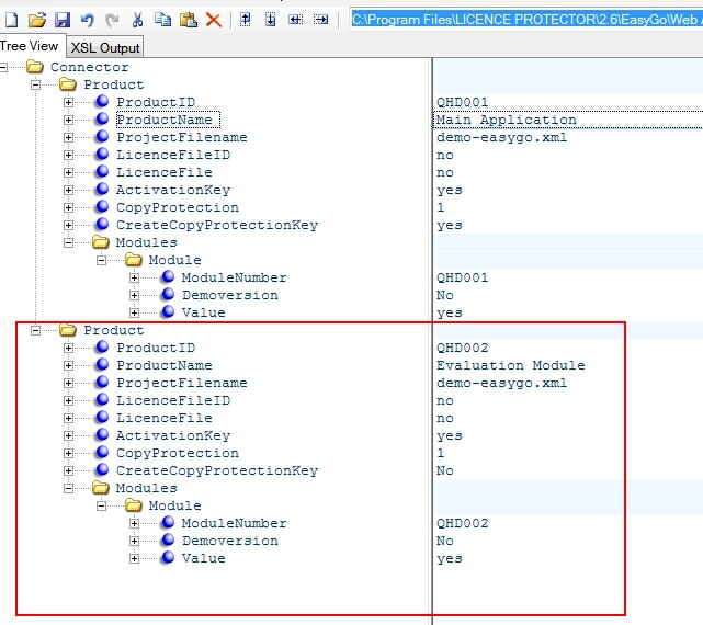 The project.config file needs no changes. Only the workflow file (config-autogenerator-easygo.xml) has to be changed. You have to add a second product with the module ID of the Evaluation Version module.