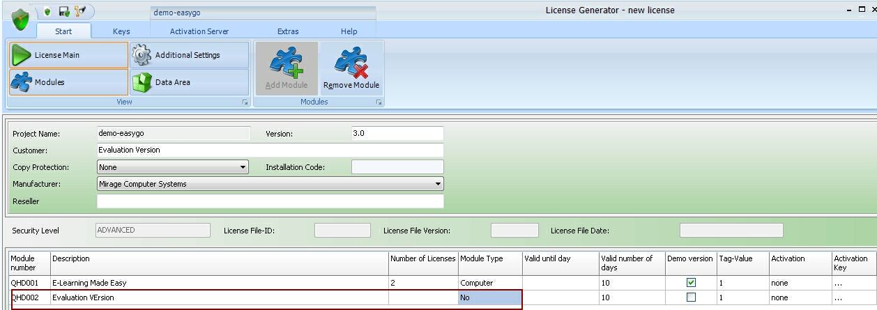 Use the workflow settings - No evaluation version, product activation, full version for the additional module (sample is QHD002).