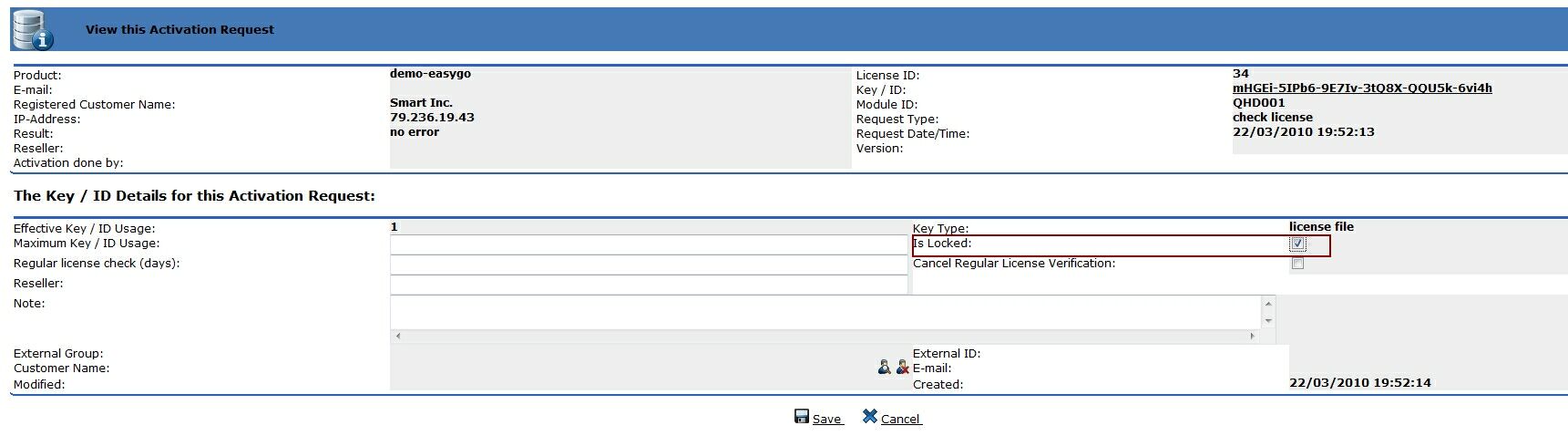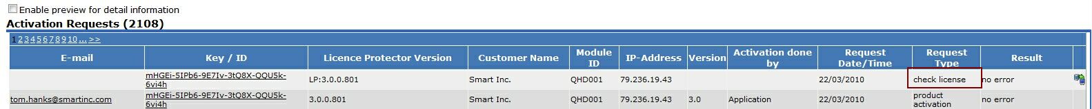Select Manage Activations Tab, Activation Requests. In the field Key / ID type in the license identification. This could be the Serial Number or your own ID and press Search. Select the record from request type: check license.