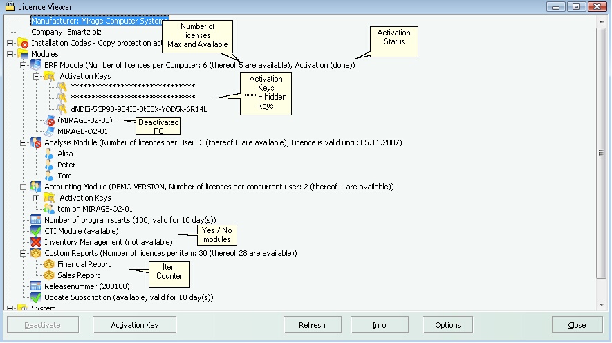 | • | Number of licenses (module type license per user, PC, concurrent or item counter) |