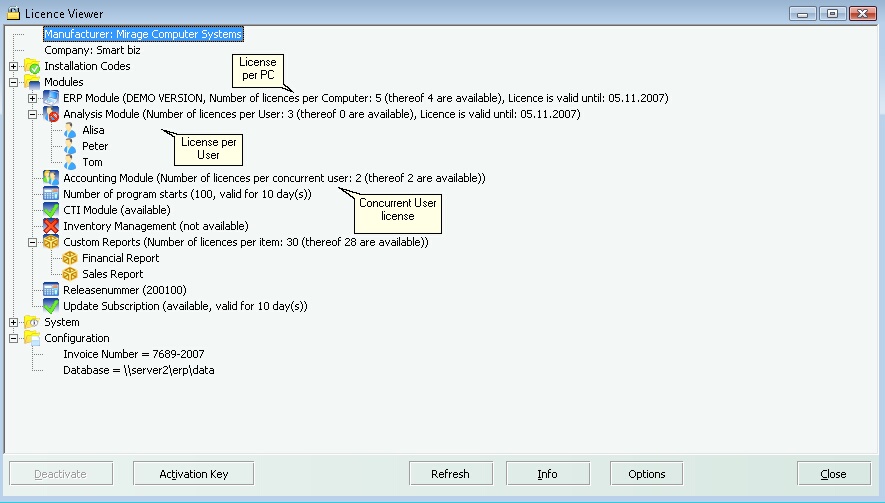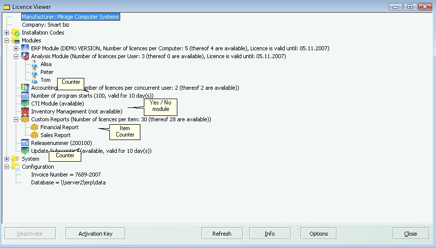 Licence Protector uses a license file (extension .lic) to store license information. It can contain one ore more modules. A module is a function you want to license, e.g. Basic Version, Add-ON1, Add-ON2. Each module can have individual license information like number of users, time limitation or demo version.