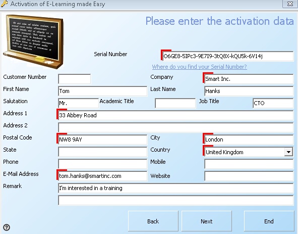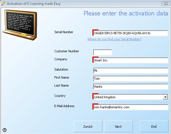 This screen collects Serial Number, Customer Number, Company name, Salutation, First and Last Name, Country (using a picklist which includes all countries of the world) and E-Mail address.