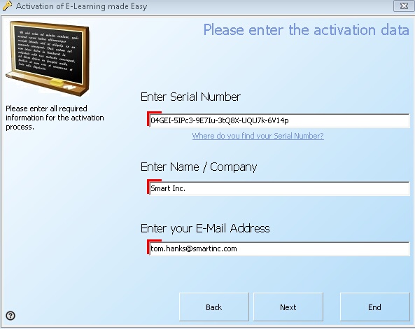 This screen collects Serial Number, Name/Company name and E-Mail address
