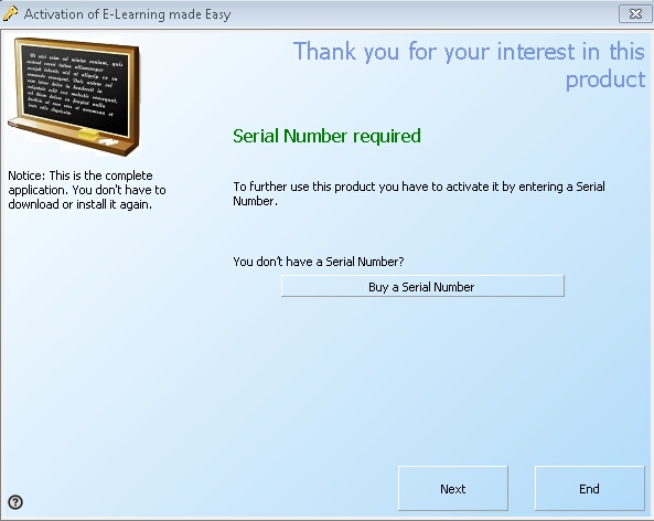 If the serial number is not entered until the end of the evaluation period, a special message screen with a link AND a button to buy is displayed. It is not possible to continue without activating the product.