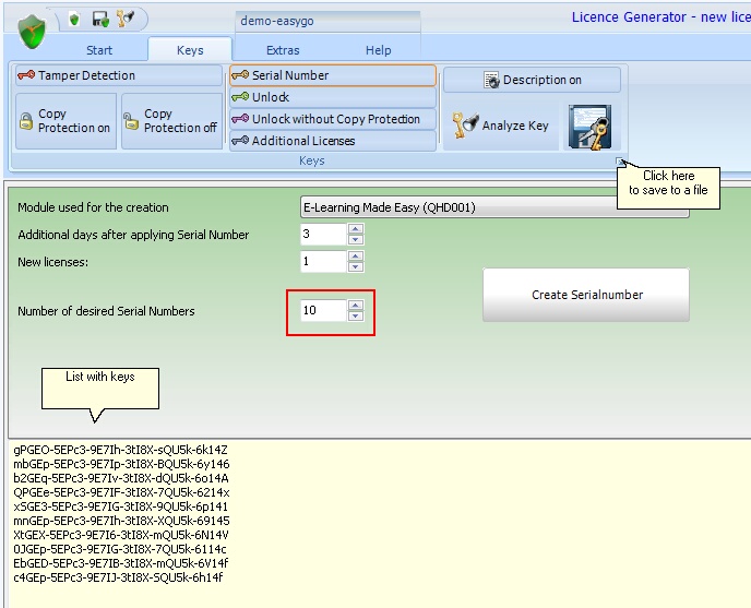 The key list file can be generated within the screen - Keys, Serial Number. Enter the desired number of serials, press button Create Serial Number and then the button Save generated keys to file.