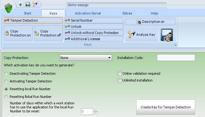 Select either Resetting the local Run Number (for a single user application) or Resetting the global Run Number (for a network application). As an option you can select Online validation required to ensure that the key can be used only once. Use Online validation required to ensure, the key cannot be used on multiple PCs. Uncheck Unlimited installation to ensure, the key cannot be used twice on the same license file.