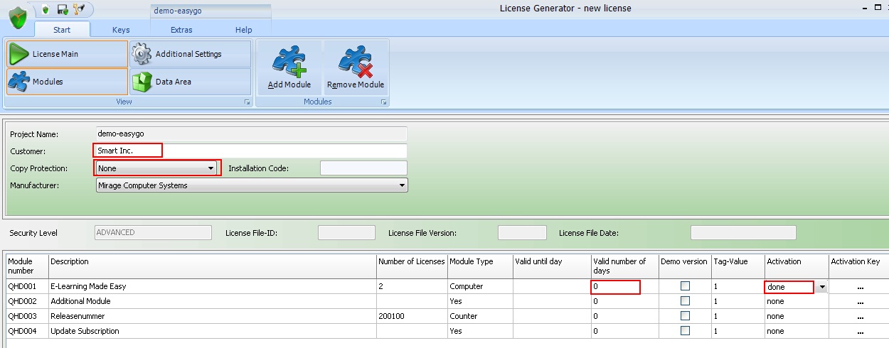 Select Data Area in the main screen. It allows to edit and modify data, which is stored in the data area of the license file. For full details see chapter Store data in the license file.