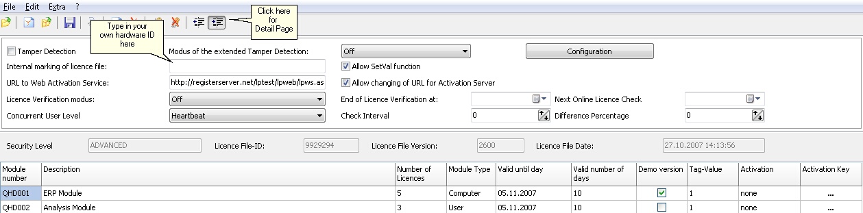 Switch to the detail page in the License Generator and the in your hardware ID in the field Internal marking of license file