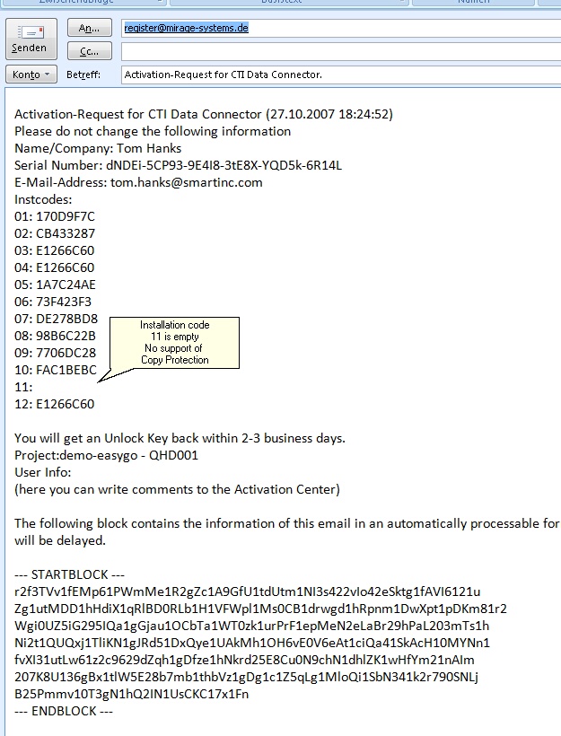 The USB-Stick protection uses the installation code 11. For activation by e-mail, fax, phone nothing specific has to be considered. See chapter: Unlock Key. If the installation code 11 is empty, then the USB-Stick does not support copy protection.