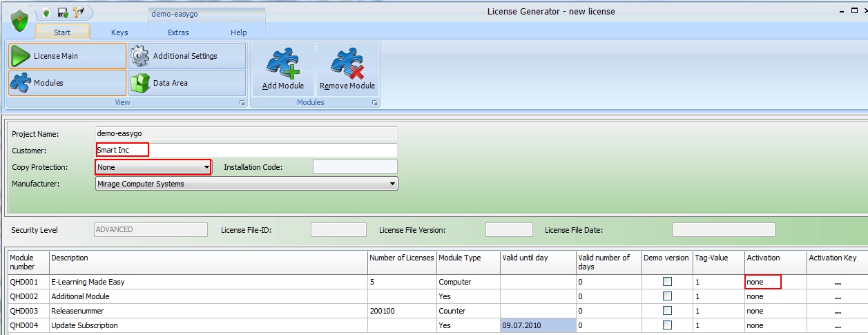 This license file should have the same settings like the generic license file (including time limitation for the main module) but all other modules the customer has bought without time limitation and set to the values needed (e.g. set number of licenses bought). The time limitation of the main modules defines the time the customer can use the software before he has to activate it.