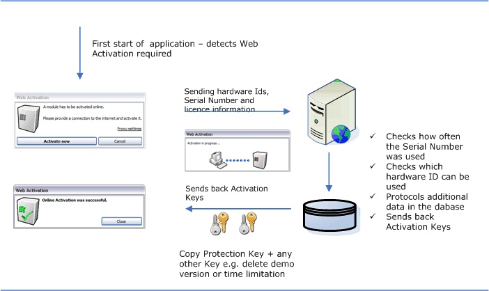 The hardware IDs and the Serial Number is sent to the Web Activation server, verified, stored in a data base and in case the Serial Number was not used before, copy protection is activated and time limitation is deleted to allow a an unlimited program start.