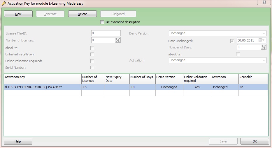 The Activation Key is automatically copied to the clipboard, e.g. to e-mail the key. You can copy a selected key into the Clipboard using the button Clipboard.