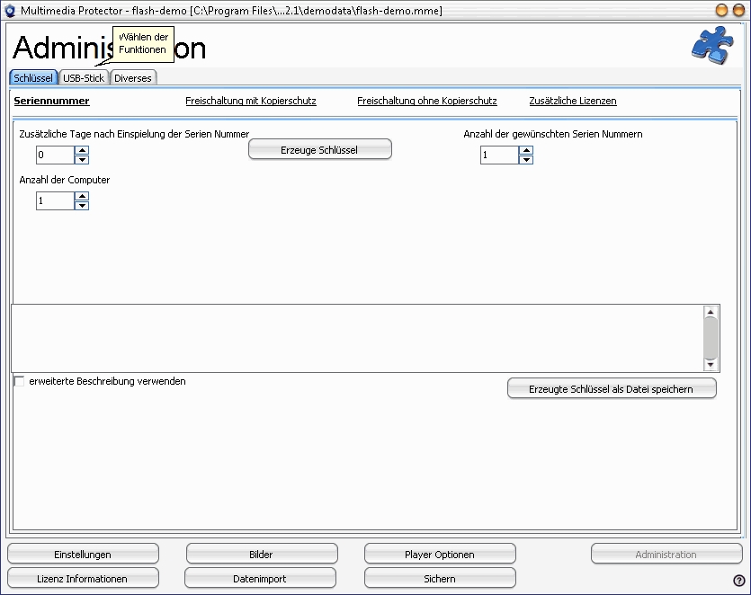 | • | Schlüssel (Erzeugen einer Seriennummer, eines Freischaltschlüssels oder einem Schlüssel für weitere Lizenzen) |