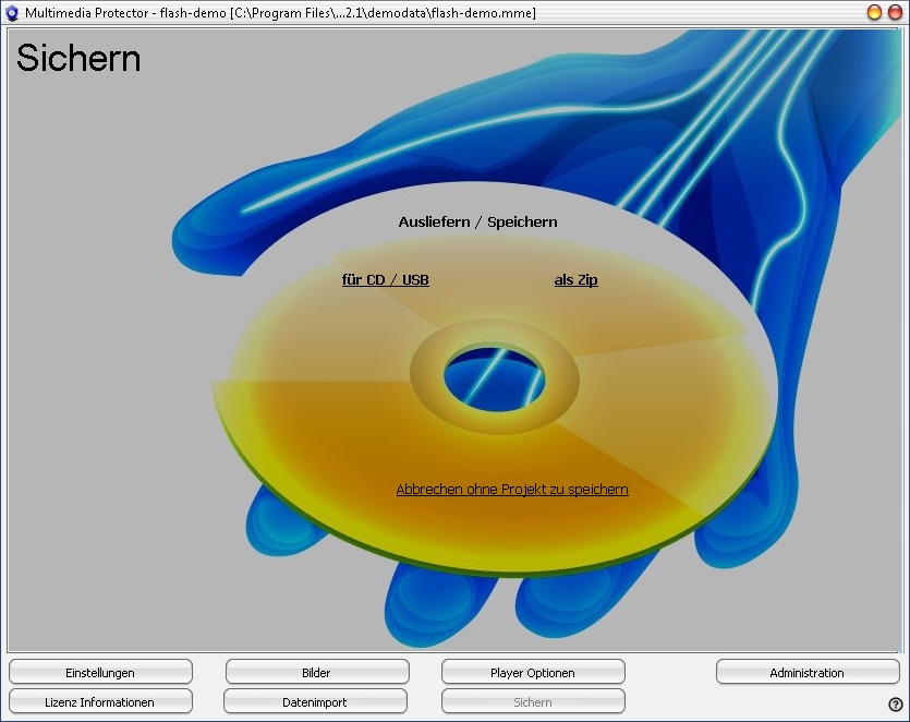 | • | Um ein Projekt zu speichern, klicken Sie auf: "Ausliefern / Speichern für CD / USB". Stellen Sie sicher, dass keine der zu importierenden Dateien von einem anderen Programm geöffnet ist. |