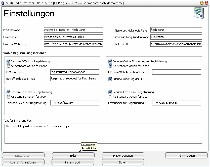 Im oberen Bereich des Bildschirmes werden Ihnen die Detailinformationen, zu der im unteren Bildschirmbereich ausgewählten Kategorie (wie zum Beispiel "Einstellungen" oder "Lizenzinformationen"), angezeigt.