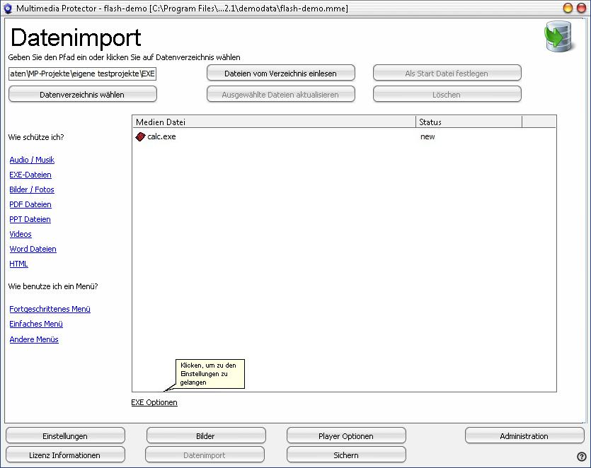 Sie können auch eine oder mehrere EXE Dateien, sowie weitere *:dll oder Konfigurationsdateien importieren. Nach Starten des Players, wird die von Ihnen zuvor definierte Startdatei ausgeführt und alle anderen, in der Datenbank enthaltenen Dateien, extrahiert. Hiernach wird der Multimedia Player beendet, sodass nur die EXE Datei ausgeführt wird.