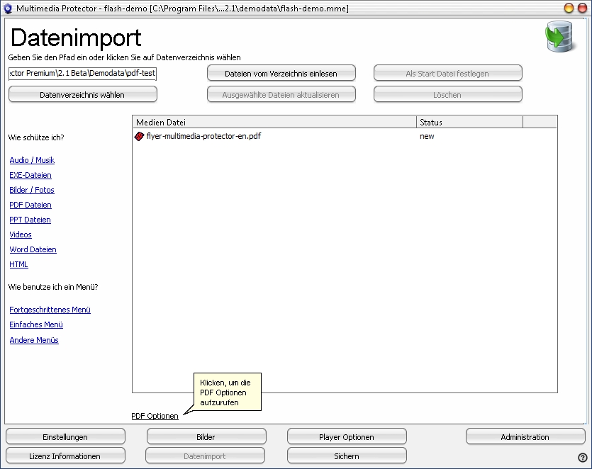 Nach Selektieren einer PDF Datei, erhalten Sie die weitere Konfigurationsoption "PDF Optionen". Nach Auswahl dieser gelangen Sie zum Konfigurationsmenü des Multimedia Protector PDF Betrachter.
