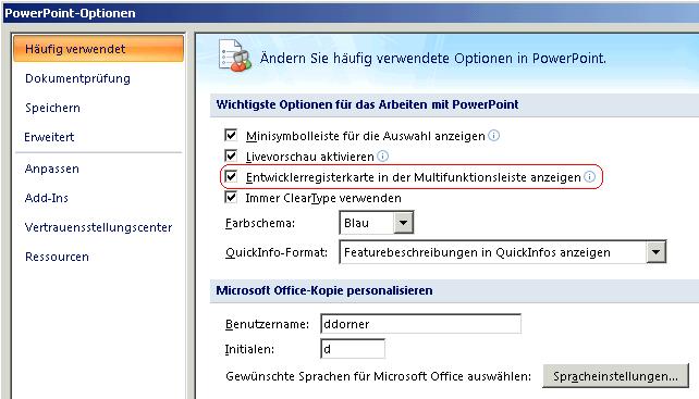 1. Klicken Sie auf die Microsoft Office Schaltfläche und wählen die Option "PowerPoint-Optionen". Wählen Sie in der Navigationsleiste die Option "Häufig Verwendet" und aktivieren die Option "Entwicklerregisterkarte in der Multifunktionsleiste anzeigen". Schließen Sie hiernach das Dialogfenster durch Klicken auf die Schaltfläche "OK".