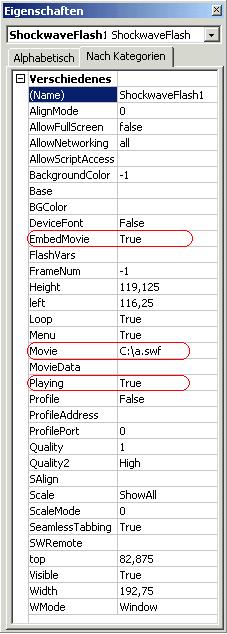 5. Definieren Sie innerhalb der Registerkarte "Alphabetisch", unter der Eigenschaft "Movie", den vollständigen Pfad Ihrer Flash-Datei. Beispiel: "C:\a.swf".
