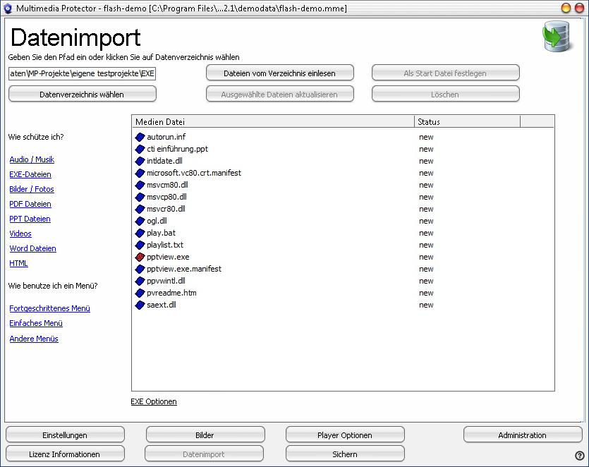 Importieren Sie nun alle Dateien Ihres Projektverzeichnisses und definieren die Datei "pptview.exe" als Startdatei. Diese ist nun durch ein rotes Symbol gekennzeichnet.