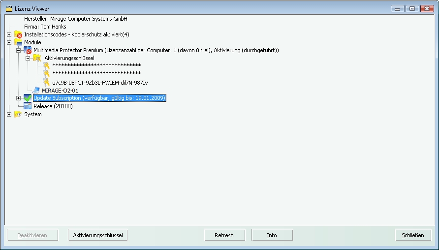 Verwenden Sie die automatische Update Überprüfung um sicherzugehen, dass Sie immer die aktuelle Programmversion nutzen. Die Versionsnummer können Sie in der Kategorie "Administration", durch Klicken auf den Link Über Multimedia Protector, einsehen. Beachten Sie: Updates können nur angewandt werden, wenn Sie über eine gültige Updateberechtigung verfügen. Sie können den Status Ihrer Updateberechtigung im Administrationsbildschirm, durch Klicken auf den Link Lizenzinformationen anzeigen, einsehen. Das Modul Online Update darf nicht abgelaufen sein. Das Updateprogramm verwendet nicht das Systemdatum, sondern das Releasedatum zur Berechnung. Beispiel: